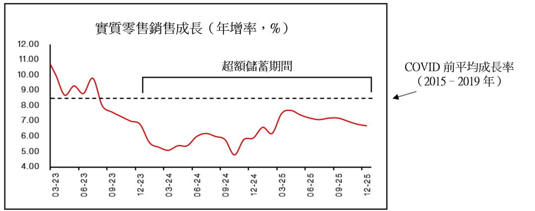 到 2026 年中,消費增長大概率會回到更接近常態的水準,但很難出現爆發式反彈。原因在於,家庭已經有近三年的時間慢慢重建儲蓄;同時,過去兩年居民收入仍維持 6% 至 7% 左右的增速,2025 年股票和房地產價格又明顯上漲,這些都會繼續改善消費信心。