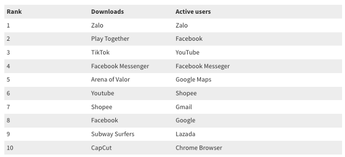 2022年6月30-7月6日,越南互聯網市場中,下載量和活躍用戶數排名前十的應用 圖源:Data.ai