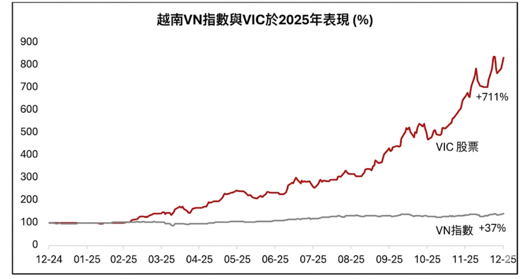 2025 年 VN-Index 的上涨,很大程度上是由 Vingroup 的超额表现带动的。